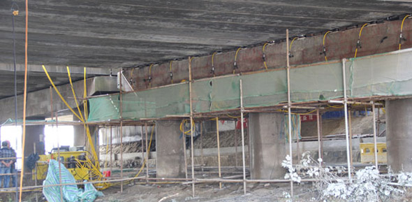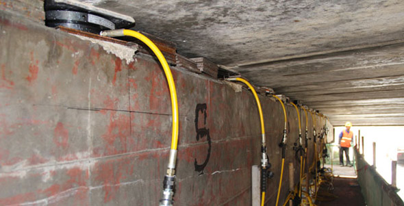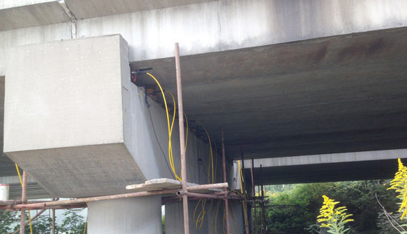 江廣高速公路改造工程JG-GG-2標(biāo)許莊周梓中溝中橋,采用同步千斤頂104臺將原有橋梁抬高50mm及舊支座進(jìn)行更換,此項目為泰州市重點(diǎn)城建項目、國家高速主干道京滬高速江都至廣陵段(簡稱江廣高速)改擴(kuò)建工程, 此次工程將對該橋進(jìn)行拼寬拓孔,即在原有位置往東側(cè)增加4孔,加長86米。